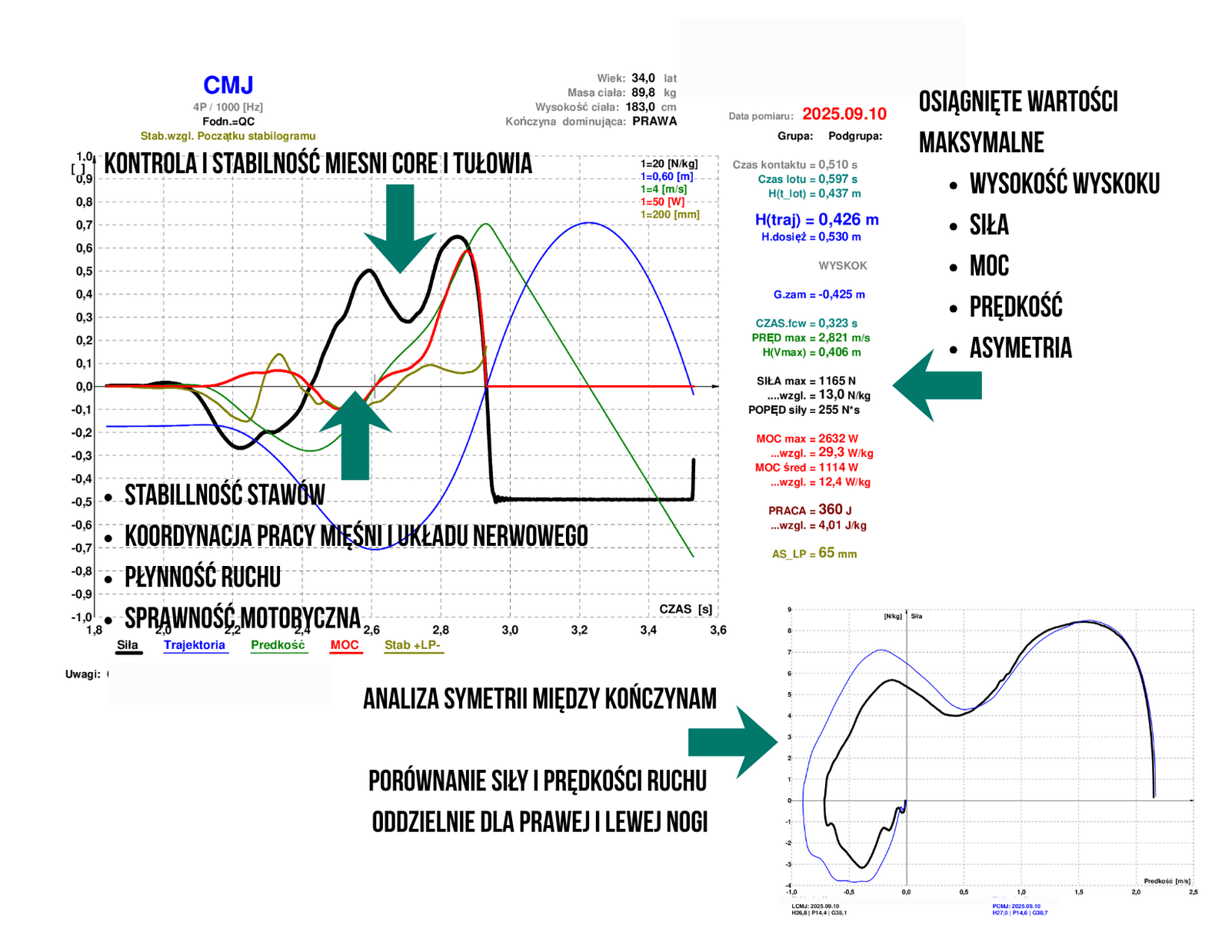 Badanie na platformie dynamometrycznej polega na wykonaniu kilku prostych testów skoczności, a urządzenie rejestruje siłę reakcji podłoża, z jaką wykonujemy dane zadanie ruchowe. System zbiera informację o impulsie włożonej siły podczas ruchu i rejestruje wykres tej siły w czasie oraz jej rozkład między prawą i lewą kończyną, co pozwala ocenić asymetrię i przeciążenia. Zebrane wartości siły i czasu są przeliczane komputerowo na inne wielkości fizyczne opisujące efektywność ruchu, jak prędkość, moc, eksplozywność, i pokazywane w postaci konkretnych wartości i wykresów. Opisanie wszystkich parametrów odpowiedzialnych ruch pozwala szczegółowo analizować maksymalny potencjał zawodników i pacjentów, słabe i mocne strony, oraz z duża skutecznością wskazywać na konkretne struktury chrząstko-więzadłowo-ścięgniste, które wymagają regeneracji, albo prowokują ból i niestabilność kwalifikując do interwencji fizjoterapeutycznej.